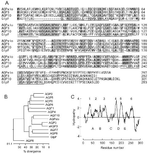 Sequence analysis. A, alignment of amino acid sequences of AQPxlo, human AQP3, human AQP10, and the bacterial glycerol facilitator GlpF. Sequences were aligned using the Megalign module (Clustal method) of the Lasergene program suite (DNAstar). Membrane-spanning segments of GlpF, derived form the crystal structure (6), are underlined, and identical amino acids are highlighted. B, dendrogram of AQPs. We used Megalign (Clustal method) to align the amino acid sequences of AQPxlo, mouse AQP 0–5, 7, and 8, rat AQP 6 and 9, human AQP10,Xenopus AQP3, and GlpF. % divergence is indicated by the summed horizontal lengths of line segments between labels.C, hydropathy analysis of AQPxlo. Hydropathy analysis (Kyte-Doolittle algorithm, window size 9) is consistent with six membrane-spanning regions (numbered 1–6) and five connecting loops (A–E).