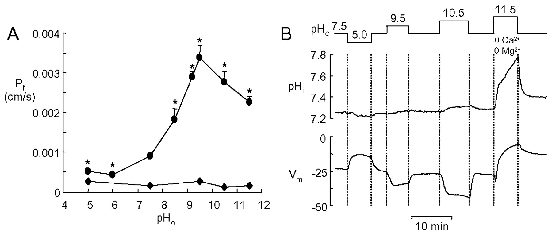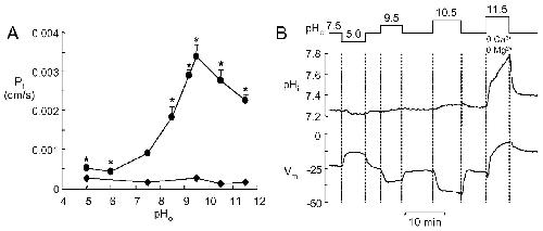 Effect of pHo changes onP f and pHi of AQPxlo-expressing oocytes. A, P f. Oocytes were preincubated for 2 min at the appropriate pHo before switching to a hypotonic solution with the same pH. Closed circles, AQPxlo-expressing oocytes; closed diamonds, water-injected oocytes. n = 5 (H2O) and 8â14 (AQPxlo).B, pHi. Microelectrodes were used to measure pHi and V m of oocytes exposed to solutions of different pHo values. Similar recordings were obtained in one other AQPxlo-expressing oocyte and two water-injected oocytes.A, asterisk indicates that the difference is statistically significant (p < 0.05) compared with the value obtained at pHo 7.5 in a two-tailed t test.Vertical bars indicate S.E. but are omitted when they are smaller than the symbol.