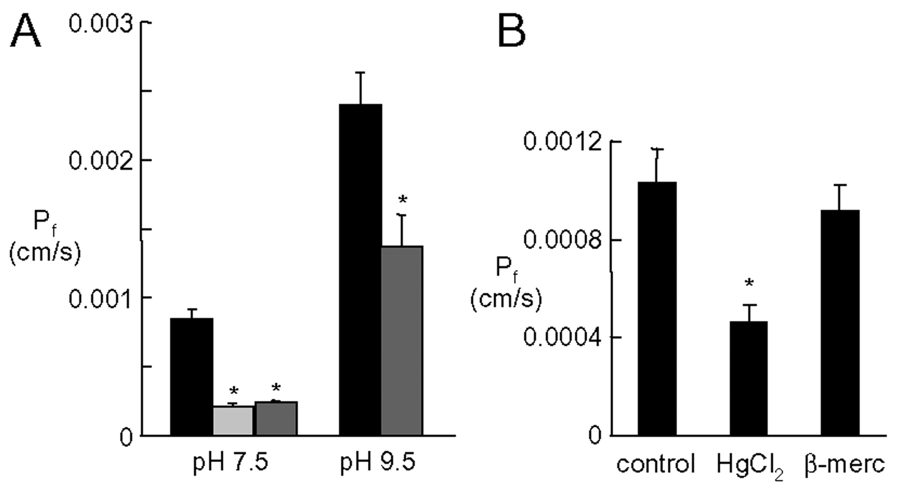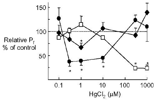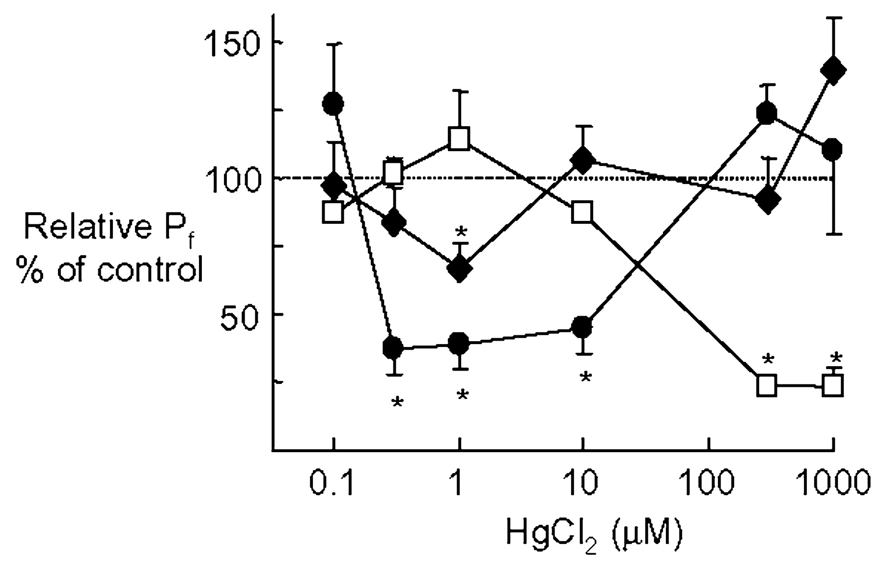 Effect of HgCl2 onP f. Oocytes injected with water (closed diamonds) or expressing either AQP1 (open squares) or AQPxlo (closed circles) were treated with the indicated concentrations of HgCl2. Data are expressed as % of control (i.e. absence of HgCl2, indicated by a dotted line). n = 6â9 (H2O), 4â6 (AQP1), and 5â12 (AQPxlo). Error bars, S.E. Asterisk indicates that the difference between (un-normalized) values in HgCl2 and controls is statistically significant (p < 0.05) in a two-tailedt test.