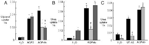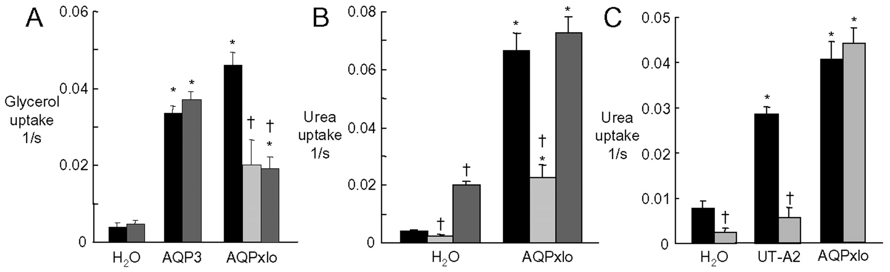 Effect of HgCl2 and phloretin on glycerol and urea uptake. A, effect of HgCl2 on glycerol uptake in water-injected oocytes and oocytes expressing AQP3 or AQPxlo. B, effect of HgCl2 on urea uptake in water-injected oocytes and in oocytes expressing AQPxlo. Black bars indicate control condition; light gray bar, 1 μMHgCl2; and dark gray bars, 300 μMHgCl2. C, effect of phloretin on urea uptake in water-injected oocytes and oocytes expressing UT-A2 or AQPxlo.Black bars indicate control condition; gray barsindicate 500 μM phloretin. A and B,error bars, S.E. n = 6â16; C,n = 4â8. Asterisk indicates that the difference between that value and water-injected control is statistically significant (p < 0.05) in a two-tailedt test. Dagger indicates that the difference between that value and no-drug control (black bar) is statistically significant (p < 0.05) in a two-tailedt test.