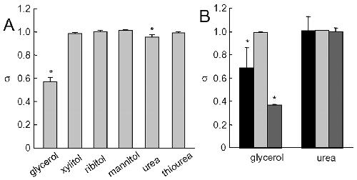 Reflection coefficients Ï for osmolytes. A, Ï measured for straight chain polyols (glycerol, xylitol, ribitol, and mannitol), urea and thiourea in AQPxlo-expressing oocytes. B, Ï measured for glycerol and urea in water-injected oocytes (black bars) and oocytes expressing AQP1 (light gray bars) or AQP3 (dark gray bars). A, error bars, S.E. n = 6;B, n = 4â6. Asterisk indicates that the value of Ï is significantly (p < 0.05) smaller than 1.