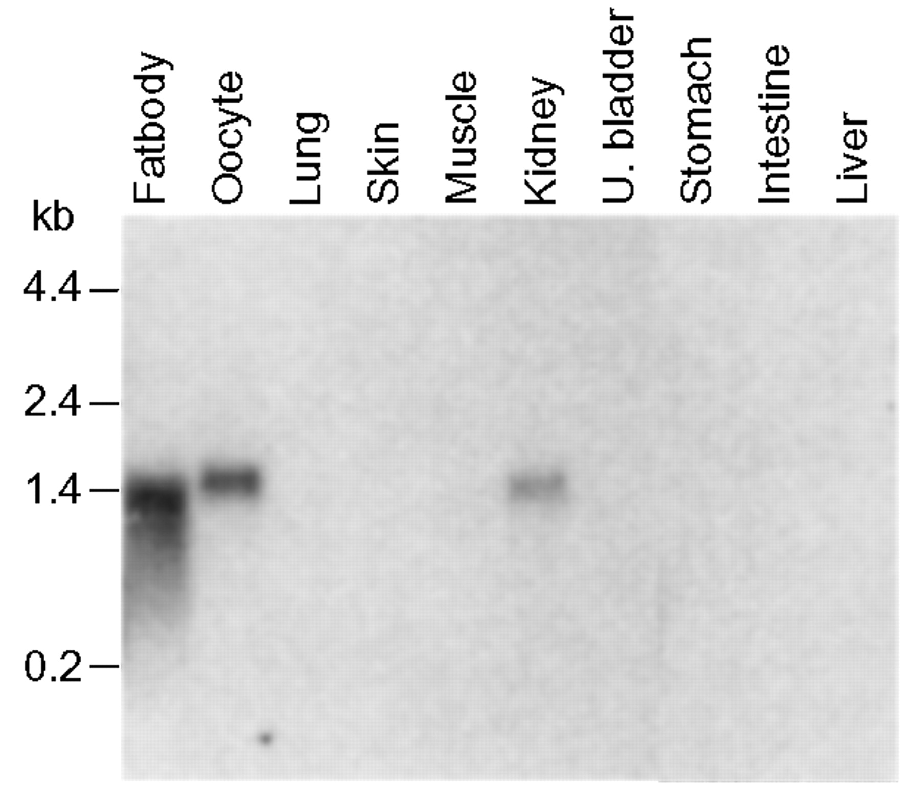 Northern blot analysis. X. laevis total RNA was probed with a 32P-labeled cDNA probe corresponding to the full coding region of AQPxlo. The RNA was run on two separate denaturing agarose gels, and the autoradiographs were apposed for display. The positions and sizes of molecular weight markers are indicated on the left. The molecular weight of the single band in fat body, oocyte,