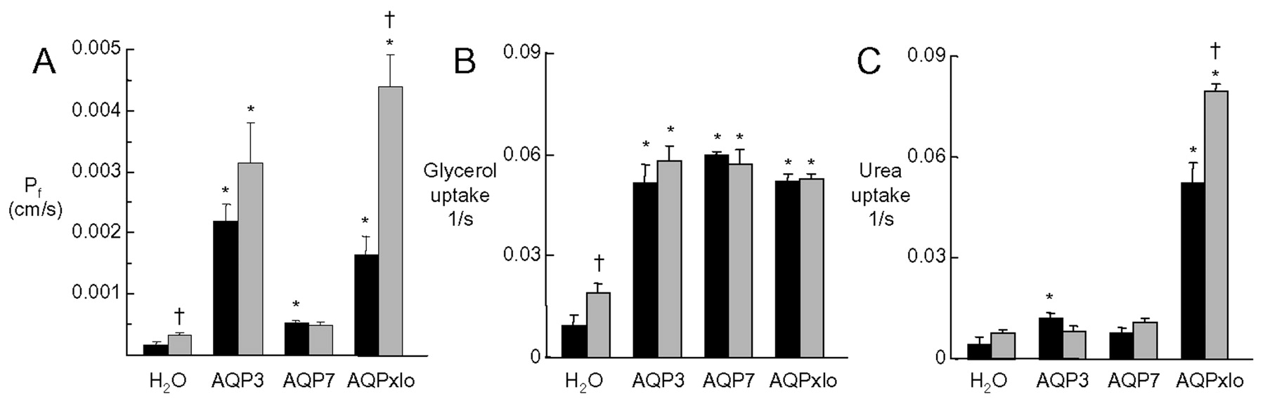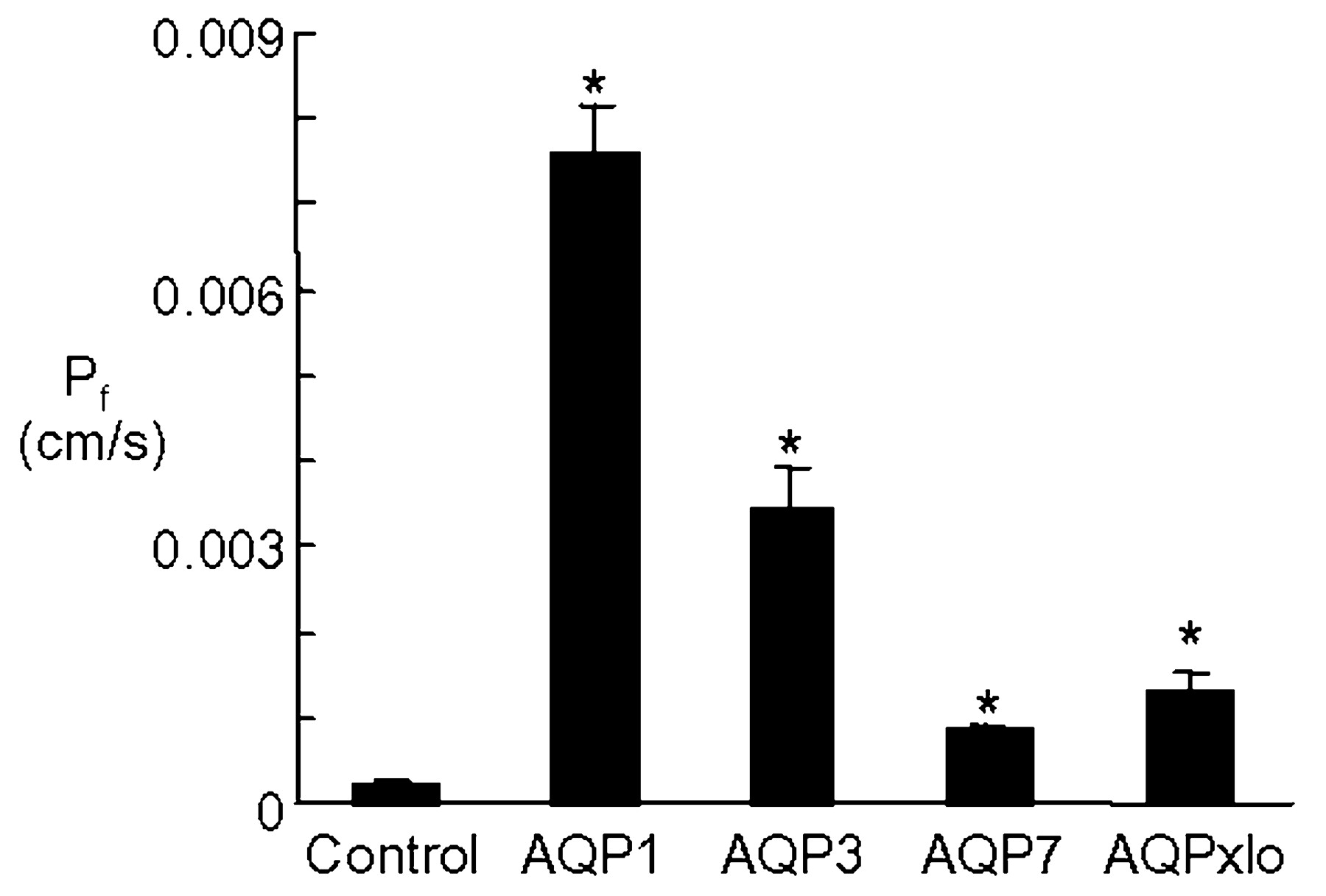 P f values of oocytes expressing different AQPs. Oocytes were injected with water or cRNA encoding AQP1 (2.5 ng/oocyte), AQP3 (10 ng/oocyte), AQP7 (10 ng/oocyte), or AQPxlo (20 ng/oocyte). Error bars, S.E.,n = 5â7. Asterisk indicates that the difference is statistically significant (p < 0.05) compared with water-injected oocytes in a two-tailed ttest.