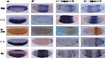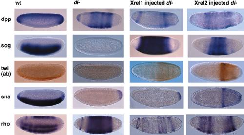 Figure 4. Injections of Xenopus Xrels mRNA into dl-/- embryos alter the expression of zygotic target genes of Dorsal protein. Whole-mount RNA in situ hybridizations and immunological staining reactions were carried out with probes for the indicated RNA probes, or Twi antibody, as indicated to the left. Embryos at the cellular blastoderm stage were oriented with anterior to the left and dorsal side up. Columns from left to right: Wild-type embryos, dorsalized dlH/Df(2L)TW119 embryos, Xenopus Xrel1 mRNA (0.25 mu g/ mu l) -injected dlH/Df(2L)TW119 embryos and Xenopus Xrel2 mRNA (0.05 mu g/ mu l) -injected dlH/Df(2L)TW119 embryos. Probes/antibody: first row: dpp. Dorsal expression in wild-type embryos and overall expression in dlH/Df(2L)TW119 embryos. Xrel1- and -2-injected dlH/Df(2L)TW119 embryos show significantly reduced expression of dpp in the central region of the embryo where the injection occurred. Second row: sog. Ventral expression in wild-type embryos and no expression in dlH/Df(2L)TW119 embryos. Xrel1- and -2-injected dlH/Df(2L)TW119 embryos exhibit high expression of sog. Third row: Twist. Ventral expression of Twist protein in wild-type embryos and no expression in dlH/Df(2L)TW119 embryos. In Xrel1- and -2-injected dlH/Df(2L)TW119 embryos, Twist protein can be detected around the dorsoventral (DV) circumference in a distinct area near the injection site where the highest concentrations the Xrel mRNAs were likely to be. Fourth row: sna. Ventral expression in wild-type embryos, no expression in dlH/Df(2L)TW119 and Xrel1-injected dlH/Df(2L)TW119 embryos. Xrel2-injected dlH/Df(2L)TW119 embryos show faint sna expression close to the injection site. Fifth row: rho. Rhomboid exhibits its complex expression pattern in wild-type embryos by showing an anterior ldquo head rdquo stripe, a dpp-dependent dorsally located and a dorsal-dependent ventral expression domain. In dlH/Df(2L)TW119 embryos, the ventral expression domain disappears and the two dorsal ones spread circumferentially around the DV axis of the embryo. In Xrel1- and -2-injected dlH/Df(2L)TW119 embryos, the dpp-dependent dorsal expression of rho is almost ablated, but its ventral expression domain is not restored.