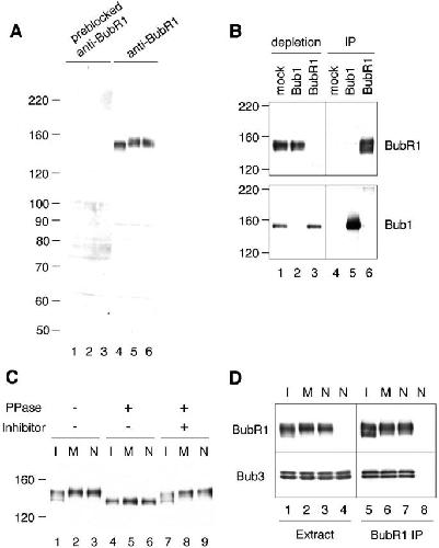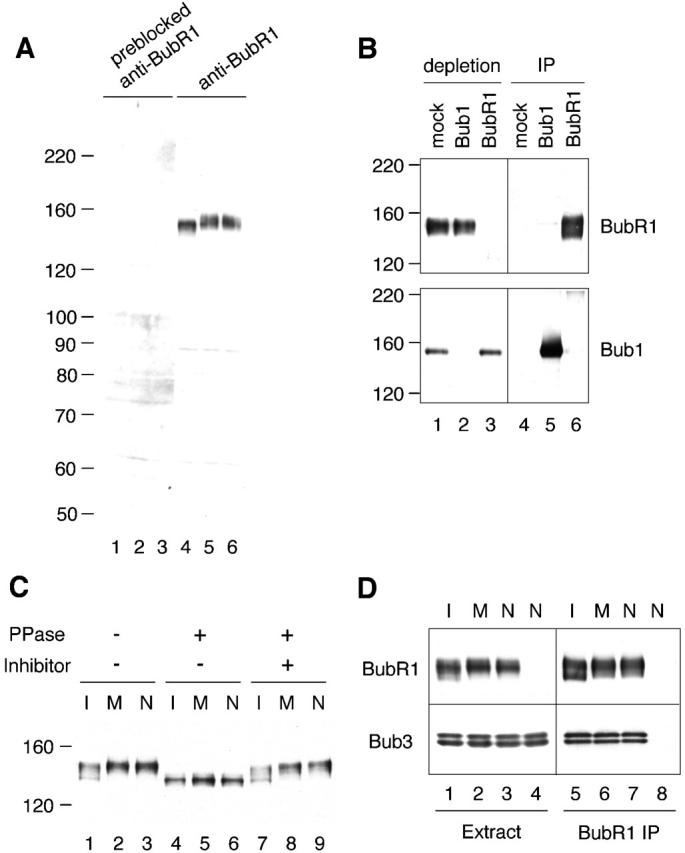 Figure 1. BubR1 is a phosphoprotein associated with Bub3. (A) Specificity of the anti-BubR1 antibody. Interphase (lanes 1 and 4), metaphase (lanes 2 and 5), or spindle checkpoint–active (lanes 3 and 6) extracts were immunoblotted with anti-BubR1 antibody (lanes 4–6) or the same antibody preincubated with recombinant BubR1 protein (lanes 1–3). The migration of molecular standards is indicated on the left. (B) Anti-BubR1 antibody recognizes BubR1, but not Bub1. Immunoprecipitation was performed from metaphase extracts with a control IgG (lanes 1 and 4), anti-Bub1 (lanes 2 and 5), or anti-BubR1 (lanes 3 and 6) antibody. The supernatants left after immunoprecipitation (lanes 1–3) or the immunoprecipitates (lanes 4–6) were probed with anti-BubR1 (top) or anti-Bub1 (bottom) antibody. The migration of molecular standards is indicated on the left. (C) BubR1 is a phosphoprotein. Interphase (I; lanes 1, 4, and 7), metaphase (M; lanes 2, 5, and 8), and spindle checkpoint–active (N; lanes 3, 6, and 9) extracts were treated with phosphatase buffer (lanes 1–3), LPP (lanes 4–6), or LPP and phosphatase inhibitors (lanes 7–9). The extracts were then immunoblotted with anti-BubR1 antibody. The migration of molecular standards is indicated on the left. (D) BubR1 associates with Bub3. Anti-BubR1 immunoprecipitates were prepared from interphase (lanes 1 and 5), metaphase (lanes 2 and 6), or spindle checkpoint–active (lanes 3 and 7) extracts, or from Bub1-depleted extract with the spindle checkpoint provoked (lanes 4 and 8). The extracts (lanes 1–4) or the immunoprecipitates (lanes 5–8) were immunoblotted with anti-BubR1 (top) or anti-Bub3 (bottom) antibody.