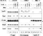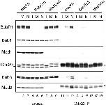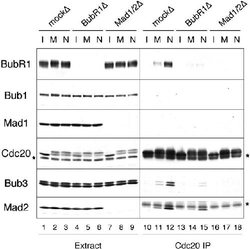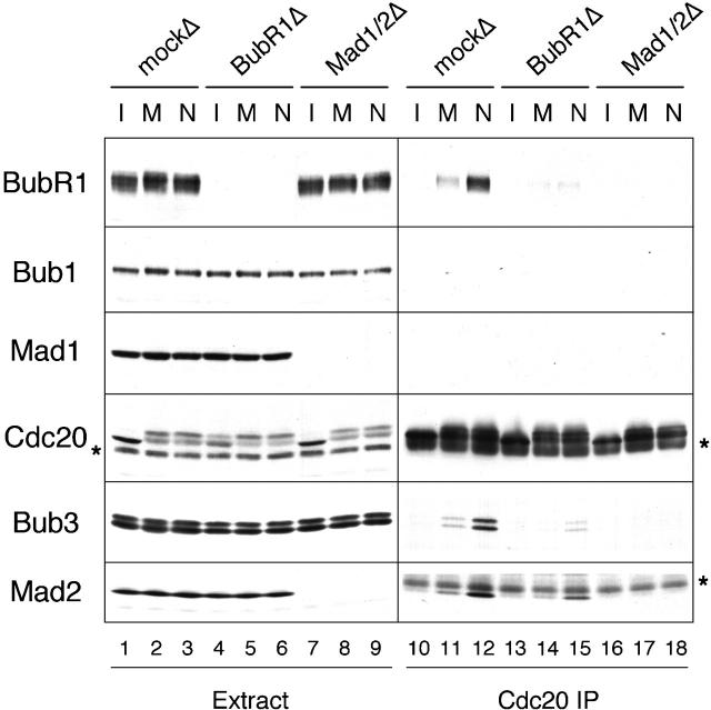 Figure 2. Mutual dependency between BubR1 and Mad2 in binding to Cdc20. CSF-arrested extracts were depleted with control IgG (mockΔ; lanes 1–3 and 10–12), anti-BubR1 (BubR1Δ; lanes 4–6 and 13–15), or anti-Mad2 (Mad1/2Δ; lanes 7–9 and 16–18) antibody. The extracts were induced to enter interphase (lanes 1, 4, 7, 10, 13, and 16), were kept at metaphase (lanes 2, 5, 8, 11, 14, and 17), or were incubated with nuclei and nocodazole to activate the spindle checkpoint (lanes 3, 6, 9, 12, 15, and 18). Anti-Cdc20 immunoprecipitates were prepared from these extracts. The extracts (lanes 1–9) or immunoprecipitates (lanes 10–18) were immunoblotted for the proteins indicated on the left. The asterisks indicate a cross-reacting protein and IgG heavy chain on the left and right panels of Cdc20 blots, respectively. The asterisk on the right of Mad2 blot indicates IgG light chain that migrates right above Mad2. Immunodepletion with anti-Mad2 antibody removes both Mad1 and Mad2.