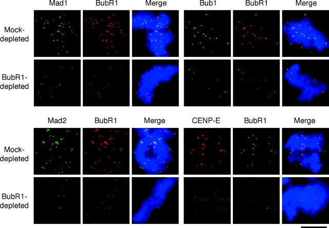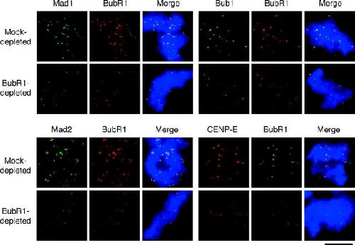 Figure 3. BubR1 is required for kinetochore binding of Mad1, Mad2, Bub1, and CENP-E. Mitotic chromosomes were isolated from mock- or BubR1- depleted extracts treated with nocodazole and then incubated with rabbit antibodies against Mad1, Mad2, or Bub1, as indicated on top, followed by fluorescein-conjugated anti–rabbit antibody. BubR1 was then detected with biotinylated anti-BubR1 antibody and Texas red– conjugated streptavidin. For double staining of CENP-E and BubR1, rabbit antibody against BubR1 was used, followed by fluorescein-conjugated anti–rabbit antibody. CENP-E was then detected with biotinylated anti–CENP-E antibody and Texas red–conjugated streptavidin. Chromosomes were stained with Hoechst 33258. The merge pictures contain all three fluorochromes. All images of the same fluorochrome were taken for the same exposure time and processed in the same way. Bar, 10 μm.