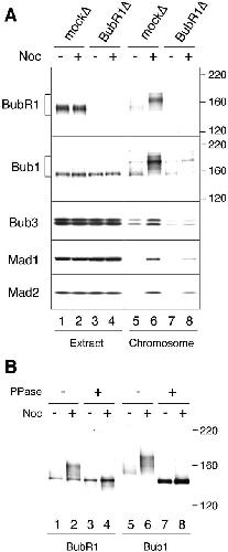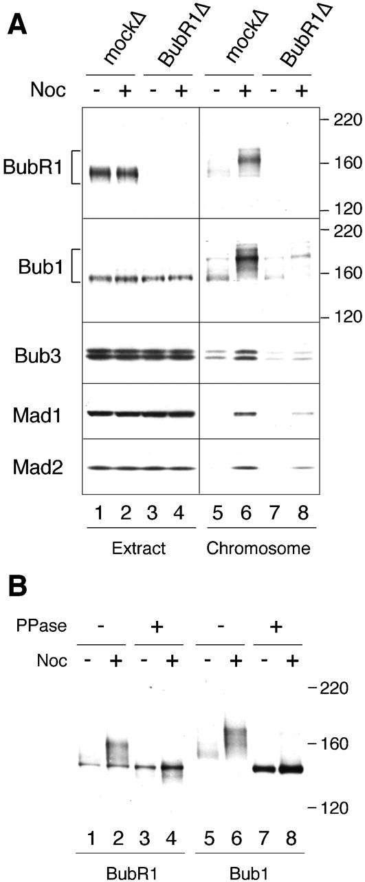 Figure 4. BubR1 is required for other spindle checkpoint proteins to associate with chromosomes. (A) Immunoblot analysis of various checkpoint proteins associated with chromosomes. Mitotic chromosomes were isolated from mock-depleted (lanes 1, 2, 5, and 6) or BubR1-depleted (lanes 3, 4, 7, and 8) extracts that were untreated (lanes 1, 3, 5, and 7) or treated with nocodazole (lanes 2, 4, 6, and 8). The extracts or chromosomal fractions were immunoblotted for proteins indicated on the left. The migration of molecular size standards is indicated on the right for BubR1 and Bub1 blots. (B) Phosphatase treatment removes mobility shift of chromosomal BubR1 and Bub1. Chromosomal pellets prepared from untreated extracts (lanes 1, 3, 5, and 7) or extracts treated with nocodazole (lanes 2, 4, 6, and 8) were treated with phosphatase buffer (lanes 1, 2, 5, and 6) or LPP (lanes 3, 4, 7, and 8). The samples were then immunoblotted for BubR1 (lanes 1–4) or Bub1 (lanes 5–8). The migration of molecular size standards is indicated on the right.