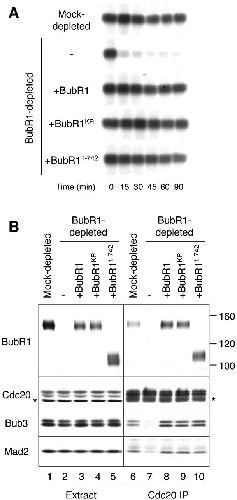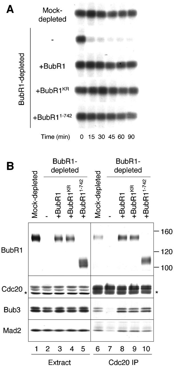 Figure 5. BubR1 is required for spindle checkpoint independently of its kinase activity. (A) Autoradiographs of histone H1 kinase assay. Extracts were depleted with a control IgG (mock depleted), or with anti-BubR1 antibody, and then supplemented with mock, wild-type BubR1, BubR1KR, or BubR11–742 as indicated on the left. The level of BubR1 protein in extracts was similar to that shown in B (lanes 1–5). After incubation with nuclei and nocodazole, calcium was added to the extracts to inactivate CSF activity and to trigger mitotic exit. Samples were taken immediately before calcium addition (time = 0) or every 15 min thereafter as indicated on bottom. (B) Extracts were depleted with a control IgG (lanes 1 and 6) or anti-BubR1 antibody and then supplemented with mock (lanes 2 and 7), wild-type BubR1 (lanes 3 and 8), BubR1KR (lanes 4 and 9), or BubR11–742 (lanes 5 and 10). The spindle checkpoint was induced in these extracts by incubation with nuclei and nocodazole, followed by anti-Cdc20 immunoprecipitation. The extracts (lanes 1–5) or the immunoprecipitates (lanes 6–10) were immunoblotted for proteins indicated on the left. Asterisks indicate a cross-reacting protein and IgG heavy chain on the left and right panels, respectively.