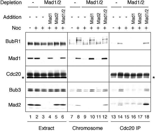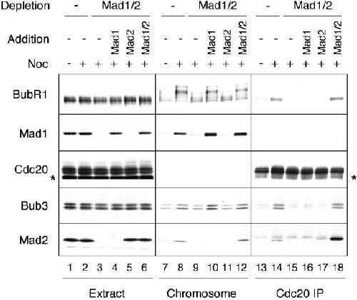 Figure 7. Hyperphosphorylation of chromosomal BubR1 requires Mad1. Mock-depleted extracts or extracts lacking Mad1 and/or Mad2 were prepared as described for Fig. 6 B (lanes 1–6). The extracts were incubated with nuclei (15,000 nuclei/μl extract) in the absence or presence of nocodazole as indicated on top. The samples were then subjected to chromosome isolation or immunoprecipitation with anti-Cdc20 antibody. The extracts (lanes 1–6), chromosomal fractions (lanes 7–12), and Cdc20 immunoprecipitates (lanes 13–18) were immunoblotted for proteins indicated on the left. The band above Mad2 in lanes 13–18 is the IgG light chain. The blots for Mad1 in Cdc20 immunoprecipitates and for Cdc20 in the chromosomal fractions are not shown, because of a lack of specific association. Exogenously added Mad1 and Mad2 tend to nonspecifically associate with Cdc20 immunoprecipitates, resulting in the high level of Mad2 in lane 18.
