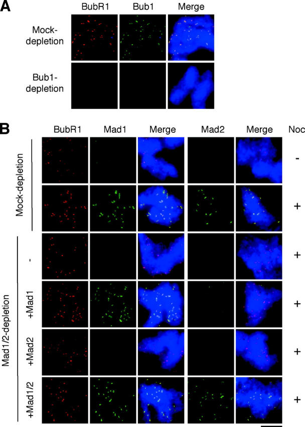 Figure 6. Localization of BubR1 to kinetochores is dependent on Bub1 and Mad1. (A) Bub1 is required for BubR1 to associate with kinetochores. Mitotic chromosomes were isolated from mock- or Bub1-depleted extracts in the presence of nocodazole and subjected to immunofluorescence staining for BubR1 and Bub1 as described for Fig. 3. The level of depletion is similar to that shown in Fig. 1 A. (B) Kinetochore association of BubR1 is reduced in the absence of Mad1. Extracts were mock depleted or depleted for both Mad1 and Mad2 (Mad1/2 depletion). The latter extracts were then supplemented with mock, Mad1, Mad2, or both Mad1 and Mad2 as indicated on the left. Mitotic chromosomes were assembled in these extracts lacking or containing nocodazole as indicated on the right. Chromosomes from each sample were isolated and loaded onto two coverslips. One set of the samples was stained for BubR1 and Mad1, the other for BubR1 and Mad2 as described for Fig. 3. For space conservation, BubR1 staining was shown for only one set of the samples. Bar, 10 μm. Immunoblot analysis of the extracts is similar to Fig. 7 (lanes 1–6).