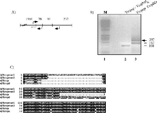 Fig. 1. NH2 isoforms of βTrCP. (A) The diagram represents the first four exons of βTrCP and their sizes, indicated as base pairs. The location of the “sense” primer is indicated by a bent arrow above the diagram. The “antisense” primers are denoted by bent arrows below the diagram. (B) Electrophoretic profile of RT-PCR amplification products obtained starting from X. laevis oocyte mRNAs and using, as primers, the oligonucleotide pair specific to exons I and II (lane 2) and the oligonucleotide pair specific to exon I and IV (lane 3) primer sets are depicted at the top of each lane. M in lane 1, the size marker, is 1 kb ladder. DNA band sizes, expressed in base pair and determined by DNA sequencing, are shown on the right side of the panel. The arrowhead points to the DNA band containing the 90 nt insertion coding for additional 30 amino acids. (C) Alignment of the human βTrCP variant 1 and 2 amino acid sequences with Xenopus βTrCP/pF112 (17), and βTrCP isoform 2. The sequence in the figure is limited to the NH2 region of βTrCP. Positions with amino acid identities are shown as black boxes. Positions with conservative changes are shown in shaded boxes.