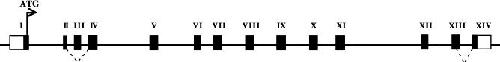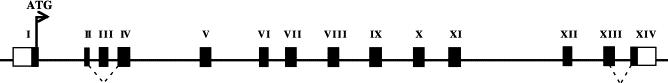 Fig. 4. The Xenopus βTrCP gene. The structure of the frog βTrCP gene and alternative splicing. Black and white boxes represent translated exon and 5′ and 3′UTR regions, respectively. Single lines represent introns. Alternative splicing is represented by dashed lines.