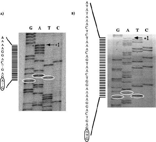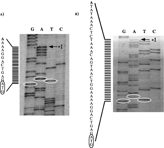Fig. 6. Transcription initiation site mapping. 5′RACE assay was performed using X. laevis oocyte polyA+ RNA. The nucleotide sequences, depicted on the left side of each panel, were derived from the autoradiograms of the coding strand (5′ to 3′ direction from top to bottom) shown in the (A) and (B) panels. Nucleotides of the ATG translation initiation codon are enclosed in open ellipses. Arrows and +1 indicate the first nucleotide after the stretch of G residues of the “sense” primer used in the amplification reactions.