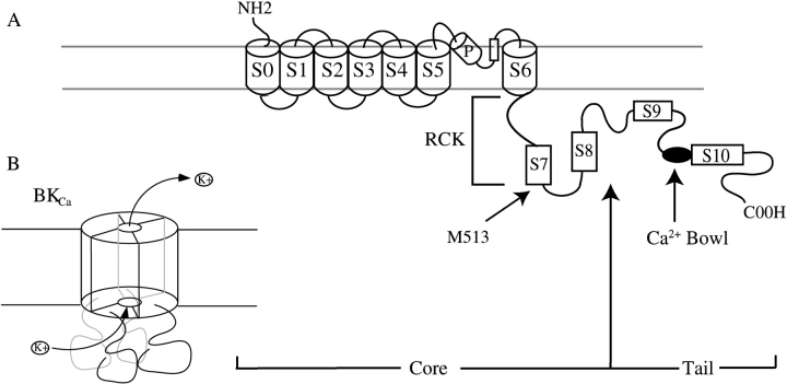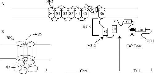 Figure 1. . Schematic diagrams of the BKCa channel. (A) Diagram of the Slo subunit, four of which form a fully functional BKCa channel. Indicated are the core and tail domains, the pore helix (P), hydrophobic regions (S1-S10), the RCK domain, and the Ca2+-bowl. (B) Schematic diagram of a Slo tetramer.