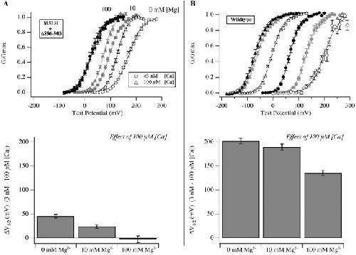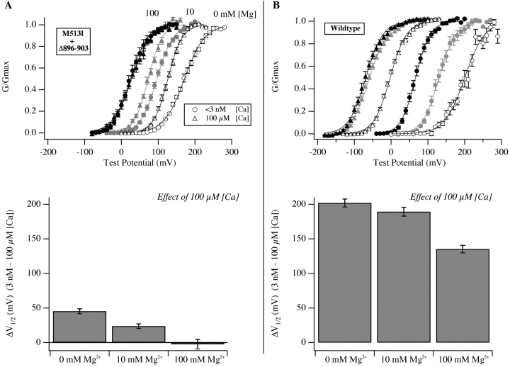Figure 5. . The remaining Ca2+ response of M513I+Δ896–903 is blocked by Mg2+. (A) Top, G-V curves for the double mutant M513I+Δ896–903. Circles represent <3 nM [Ca2+]. Triangles represent 100 μM [Ca2+]. Open symbols indicate the absence of Mg2+. Grayed symbols indicate the presence of 10 mM [Mg2+]. Darkened symbols indicate the presence of 100 mM [Mg2+]. Each curve has been fitted with a Boltzmann function. Bottom, plots of the change in V1/2 as [Ca2+] is increased from <3 nM to 100 μM in the presence of either 0, 10, or 100 mM [Mg2+]. (B) Same experiment as in A except the wild-type channel was used. Mean V1/2 values were determined from Boltzmann fits to the data from each experiment individually.