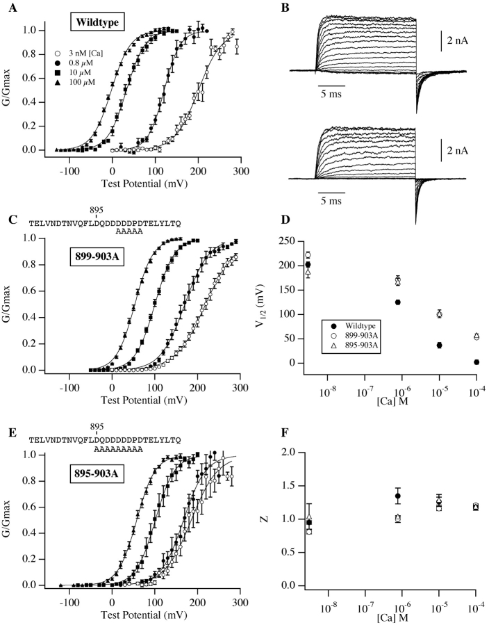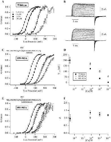 Figure 2. . Ca2+ bowl mutations reduce mSlo's Ca2+ response. (A) G-V relations determined from inside-out Xenopus oocyte macropatches expressing the mSlo protein. [Ca2+] are as indicated on the figure. (B) Wild-type (top) and mutant (895–903A; bottom) mSlo current families recorded with voltage steps to between −40 and 130 mV with 100 μM internal [Ca2+]. Tail potentials are −80 mV; holding potentials are −120 mV (top) and −100 mV (bottom). (C) G-V relations determined from patches expressing the Ca2+ bowl mutant 899–903A. The residues mutated to alanine are indicated above the plot. (D) Half maximal activation voltage (V1/2) vs. [Ca2+] plots for the data in panels A, C, and E. The points plotted are average parameter values determined from experiments fitted individually with a Boltzmann function (see Table I for values). Symbols represent channel type as indicated on the figure. (E) G-V relations determined from patches expressing the Ca2+ bowl mutant 895–903A. (F) Apparent gating valence (z), determined from Boltzmann fits, plotted as a function of [Ca2+] (see Table I for values). Symbols represent channel type as in D. Error bars in this and subsequent figures represent standard error of the mean.