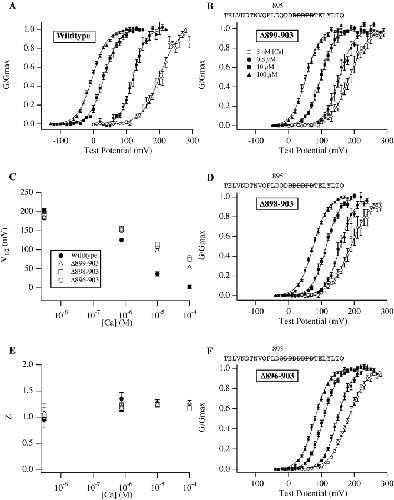 Figure 3. . Many Ca2+ bowl mutants behave similarly. (A) Wild-type G-V relations determined at a series of [Ca2+] as in Fig. 2. (B) G-V relations for the mutant Δ899–903. The residues deleted are indicated above the plot with a line drawn through them. (C) V1/2 vs. [Ca2+] plots for the channels in A, B, D, and F (see Table I for values). (D) G-V relations for the mutant Δ898–903. (E) z vs. [Ca2+] plots for the channels in A, B, D, and F (see Table I for values). Symbols represent mutants as indicated in C. (F) G-V relations for the mutant Δ896–903. In A, B, D, and F symbols represent [Ca2+] as indicated in B.