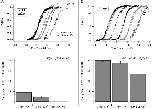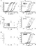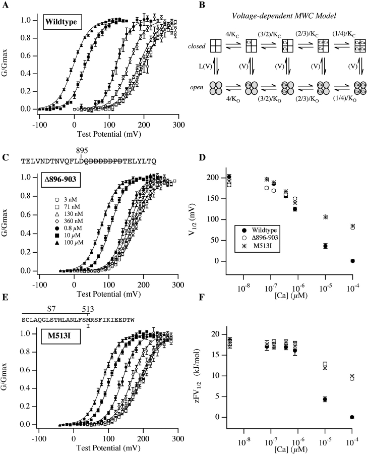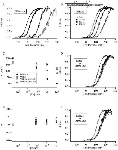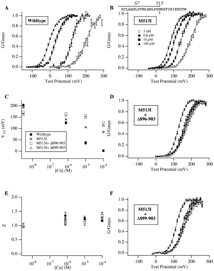 Figure 4. . Double mutants that eliminate mSlo's high-affinity Ca2+ response. (A) Wild-type G-V relations. (B) G-V relations over a series of [Ca2+] for the mutant M513I. (C) V1/2 vs. [Ca2+] plots for the channels in A, B, D, F (see Table I for values). Symbols represent mutants as indicated on the figure. (D) G-V relations for the double mutant M513I+Δ896–903. (E) z vs. [Ca2+] plots (see Table I for values). Symbols represent mutants as indicated in C. (F) G-V relations for the double mutant M513I+Δ899–903. In A, B, D, and F symbols represent [Ca2+] as indicated in B.
