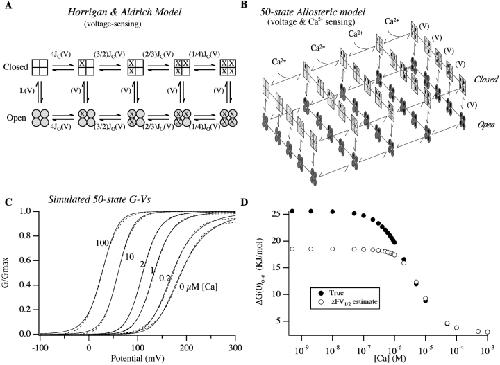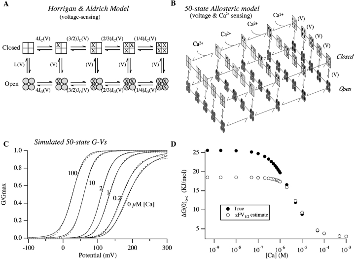 Figure 7. . A more complex model of mSlo gating suggests errors in our ΔG(0)o-c estimates at low [Ca2+]. (A). Diagram of the model Horrigan et al. (1999) used to described the voltage-dependent gating of the mSlo channel. Horizontal transitions represent voltage sensor activation. Vertical transitions represent the conformational change by which the channel opens. JC(V) and JO(V) are the equilibrium constants for voltage-sensor activation when the channel is either closed or open where: JC(V) = JC(0)exp(zFV/RT) and JO(V) = JO(0)exp(zFV/RT); and L(V) is the equilibrium constant between open and closed when no voltage sensors are active and no Ca2+ is bound where: L(V) = L(0)exp(qFV/RT). (B) 50-state mSlo model. Here Ca2+ binding occurs along the long horizontal axis, voltage sensor movement along the short horizontal axis, and transitions from the upper to the lower tier indicate channel opening. The front face of this scheme corresponds to the model in A. (C) Simulated G-V curves from the model in B at the [Ca2+] indicated on the figure. For more discussion of this model see (Cox and Aldrich, 2000; Cui and Aldrich, 2000; Rothberg and Magleby, 2000). Parameters were as follows: JC(0) = 0.066; JO(0) = 1.10; z = 0.51; L(0) = 2e-6; q = 0.4; KC = 10 μM, KO = 1 μM. Each curve is fitted with a Boltzmann function (dashed lines). (D) Plots of ΔG(0)o-c as a function of [Ca2+] for the model in C. Darkened circles indicate the true ΔG(0)o-c of the model calculated as 4RTln[(1+ [Ca]/KC)/(1 + [Ca]/KO)] + 4RTln[(1 + JC(0))/(1 + JO(0))] − RTln[L(0)], while the open circles represent estimates obtained from Boltzmann-fit parameters as zFV1/2.