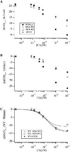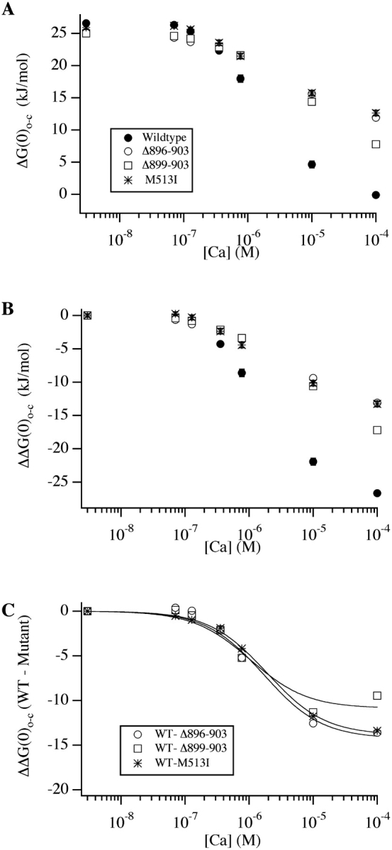 Figure 8. . Energetics of Ca2+ binding to mutant and wild-type mSlo channels. (A) Estimates of ΔG(0)o-c as a function of [Ca2+] obtained by fitting each experiment with Eq. 2 and then calculating ΔG(0)o-c from Eq. 3. Constant parameters were: JC(0) = 0.059, JO(0) = 1.020, z = 0.51, q = 0.4. Symbols indicate channel type as indicated on the plot. (B) The curves in A have been shifted so each curve has a value of 0 at 3 nM [Ca2+]. (C) WT-mutant difference curves. Each mutant's curve in B has been subtracted from the wild-type curve in B to create difference curves that indicate the properties of the site disrupted by each mutation. Error bars, which represent standard error of the mean, are included in A and B; they are often smaller than the plot symbols.