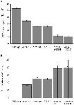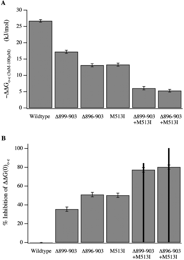 Figure 9. . Additivity of mutations. (A) −ΔΔG(0)o-c (3 nM to 100 μM [Ca2+]) is plotted for each channel type. (B) For each channel type is plotted (ΔΔG(0)o-c (3 nM to 100 μM [Ca2+])wild-type − ΔΔG(0)o-c (3 nM to 100 μM [Ca2+])mutant)/ΔΔG(0)o-c (3 nM to 100 μM [Ca2+])wild-type,, which is the percent reduction in response to 100 μM [Ca2+] caused by each mutation. Vertical black lines indicate the predictions of strict additivity, and are thus the sums of the bars for each individual mutant that contributes to a double mutant.