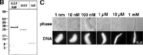 Figure 1. Partial Xenopus gp210 sequence and purification and testing of gp210 tail polypeptide. (A) Sequence alignment of rat gp210 (residues 1636–1886) and the 251-residue polypeptide encoded by the partial Xenopus cDNA. The transmembrane domain (TMD) and the 16-residue peptide (antigen) used to generate rabbit serum 3860 are underlined. Also indicated is the tail polypeptide of Xenopus gp210 that was recombinantly expressed, purified, and used to inhibit nuclear assembly. (B) SDS-PAGE gel showing the GST–gp210 tail fusion protein before (GST:tail) and after (GST, tail) cleavage by thrombin (see Materials and methods). (C) Effects of purified gp210 tail on nuclear assembly in Xenopus egg extracts. Purified gp210 tail was added to nuclear assembly reactions (final concentrations indicated) at time zero. 2 h later, nuclei were visualized by phase contrast microscopy and Hoescht staining for DNA. Bar, 10 μm.