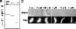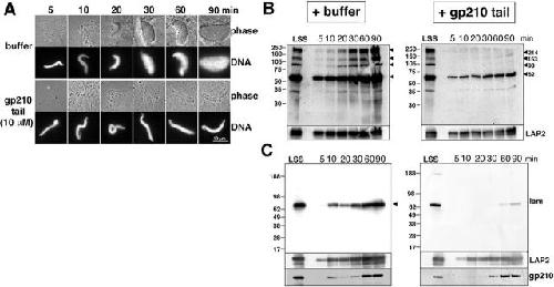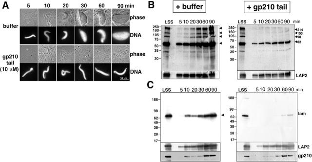Figure 2. Purified gp210 tail polypeptide inhibits nuclear growth and NPC assembly. (A) Time course of nuclear assembly in the presence of 10 μM tail polypeptide. Nuclei were assembled in the presence (10 μM) or absence (buffer control) of purified gp210 tail. Aliquots were removed at the times indicated and imaged by phase contrast microscopy to visualize nuclear membranes, and by fluorescence microscopy to visualize Hoescht-stained DNA. Bar, 10 μm. (B and C) Western blot analysis of tail-inhibited nuclei. Nuclei assembled in the presence of buffer or 10 μM gp210 tail were isolated after 5, 10, 20, 30, 60, and 90 min of assembly, run on SDS-PAGE, blotted, and probed with (B) mAb 414 to identify incorporated FG repeat nucleoporins, and (C) mAb S49F to detect lamin B3. Each blot was stripped and reprobed with antibodies against Xenopus LAP2 to confirm recruitment of nuclear-specific membranes (bottom). The blots in (C) were lastly restripped and probed with antibodies against gp210 (bottom). Lanes marked LSS (low speed supernatant) were loaded with 1 μl of crude Xenopus egg extract.