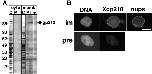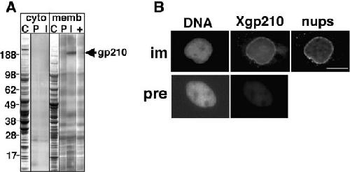 Figure 3. Polyclonal anti–tail peptide serum 3860 recognizes a 195-kD membrane protein that colocalizes with NPCs. (A) SDS-PAGE of Xenopus egg cytosol (cyto) and membrane (memb) proteins stained with Coomassie blue (C) or transferred to polyvinylidene difluoride membrane and probed with preimmune serum (P), immune serum (I), or peptide-blocked immune serum (+). (B) Immunofluorescence of Xenopus A6 cells stained with Hoescht to localize DNA, mAb 414 to localize NPCs, and either preimmune (pre) or immune (im) serum 3860 against Xgp210. Bar, 10 μm.