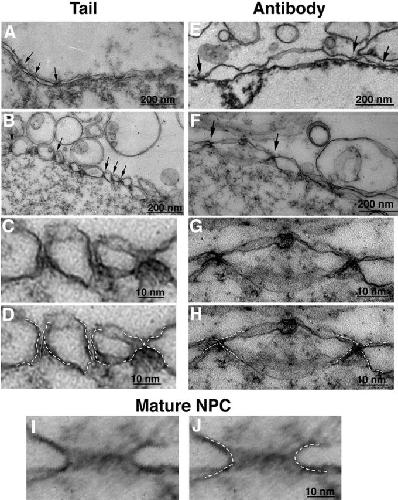 Figure 6. TEM of tail- and antibody-inhibited nuclei. Nuclei were assembled for 2 h in the presence of (A) buffer alone or (B, C, and D) 10 μM purified gp210 tail polypeptides. Control nuclei had decondensed chromatin enclosed within a typical flattened nuclear envelope with NPCs (arrows). Nuclear membranes assembled in the presence of 10 μM gp210 tail (B–D) accumulated novel arrested structures (B, arrows) consistent with a late stage of fusion or arrested dilation of nascent pores. C shows an enlarged region of B, which is reproduced in D with dashed white lines tracing the inferred position of each membrane. Dotted white lines indicate ambiguities, including places where the plane of the lipid bilayer was not perpendicular to the TEM section; such “slanted” membranes appear to split into two lines. (E–H) Antibody inhibition. Nuclei were assembled in the presence of (E) preimmune or (F–H) immune serum 3860 for 2 h. Positive control nuclei had typical nuclear envelopes with NPCs (E, arrows). Treatment with immune serum produced arrested electron-dense structures (F, arrows). G and H show an enlargement of two arrested nascent pores, with dashed white lines in H tracing the inferred position of each membrane. (I and J) Tangential section through mature NPC, with membranes traced by dashed white lines in J. Bars: (A, B, E, and F) 200 nm; (C, D, G, H, and J) 10 nm; (I) refer to bar in J.