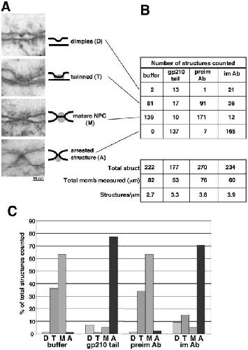 Figure 7. Quantitation of pore-related nuclear membrane structures. We (A) identified and (B) quantitated four morphological features termed dimples, twinned membranes, mature NPCs, and arrested structures on TEM micrographs of arrested and control nuclei. Results are graphed in C as the average number of each feature per micron for nuclei arrested by 10 μM gp210 tail (or buffer control), and for nuclei treated with preimmune (preimm) or immune (im) antibodies against the gp210 tail. For each positive control, the number (n) of individual nuclei from which these measurements were taken was 10; for tail polypeptide–inhibited nuclei, n = 14; for antibody-arrested nuclei, n = 15.