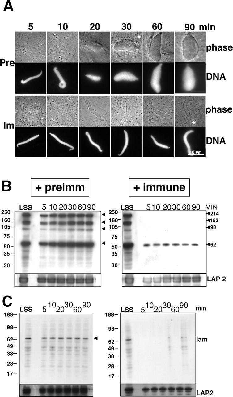 Figure 4. Antibodies to the gp210 tail inhibit nuclear growth. (A) Nuclei were assembled in the presence of immune or preimmune serum 3860 antibodies against the gp210 tail (see Materials and methods). Aliquots were removed at the times indicated, fixed, and visualized by phase contrast microscopy to show membranes and fluorescence microscopy to show Hoescht-stained DNA. Bar, 10 μm. (B and C) Western blot analysis of antibody-inhibited nuclei. Nuclei assembled in the presence of preimmune or immune serum 3860 were isolated after 5, 10, 20, 30, 60, and 90 min of incubation, run on SDS-PAGE, blotted, and probed with (B) mAb 414 to identify incorporated FG repeat nucleoporins and (C) mAb S49F to detect lamin B3. Each blot was stripped and reprobed with antibodies against Xenopus LAP2 to confirm the recruitment of nuclear-specific membranes (bottom).