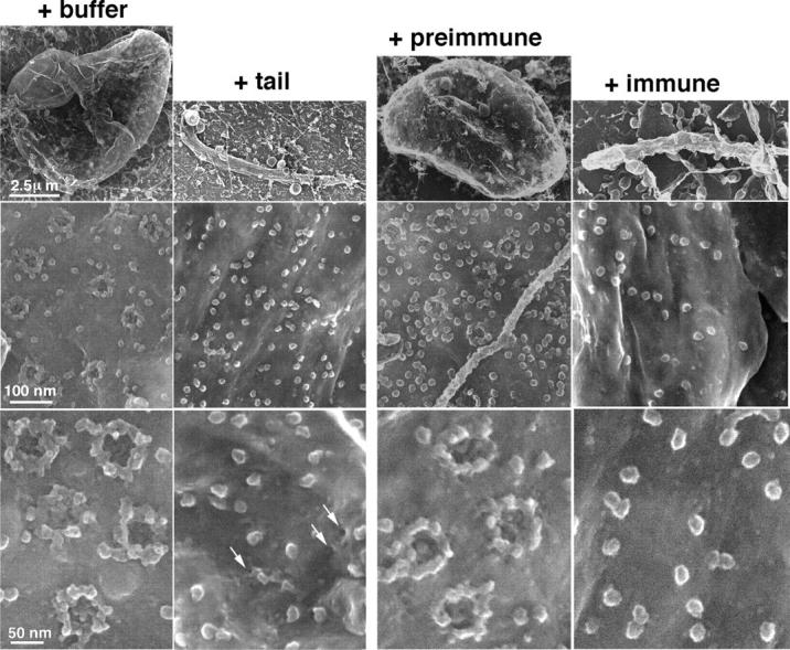 Figure 5. SEM of tail- and antibody-inhibited nuclei coated with a 2.5-nm layer of chromium. Top row shows nuclei at low magnification to demonstrate the growth arrest caused by exogenous gp210 tails and immune antiserum. (Left) Nuclei were assembled for 2 h in the presence of buffer (+ buffer) or 10 μM purified gp210 tail (+ tail). Control nuclei were enclosed by flattened membranes with mature NPCs, best seen at higher magnification in the bottom. Nuclei assembled with 10 μM gp210 tails were enclosed by fused and flattened nuclear membranes that lacked mature NPCs, but did have tiny pores (+ tail, bottom, arrows). (Right) Nuclei were assembled with either preimmune (+ preimmune) or immune (+ immune) antisera against the gp210 tail. Preimmune-treated control nuclei had typical nuclear envelopes and NPCs (+ preimmune, bottom). Nuclei assembled with immune antibodies were enclosed by flattened membranes that lacked any surface-detectable pore-related structures. Scale bars (left) apply to each row.
