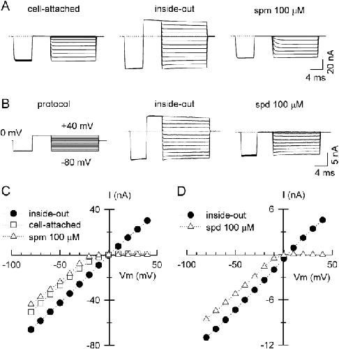 Figure 1. . Inward rectification of Kir2.1 current in cell-attached patch versus inside-out patch. (A) Currents were recorded from Xenopus oocytes injected with Kir2.1 mRNA in the cell-attached patch configuration (left) and following excision as an inside-out patch in the absence (middle) or presence of 100 μM spermine (right). (B) Currents recorded from a different patch in the absence (middle) and presence (right) of 100 μM spermidine. The voltage clamp protocol is shown in the left panel of B. The dotted lines indicate the zero current level. (C) I-V curves of the steady-state current at the end of the test pulses in A. (D) I-V curve of the steady-state current at the end of the test pulse in B. Note the similar shapes of the I-V curve for the cell-attached patch and the excised inside-out patch with 100 μM spermine or spermidine present.