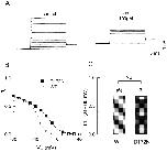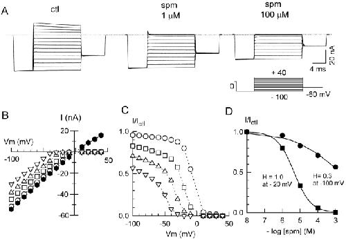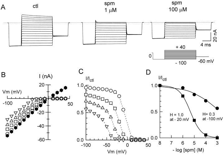 Figure 2. . Macroscopic I-V relationship for different concentration of spermine. (A) Representative current traces recorded from inside-out patch in the presence of 0 (control), 1, and 100 μM spermine. The dotted line indicates the zero current level. Voltage protocol is shown at the bottom. (B) Steady-state I-V curves for control (), and 1 μM (○), 10 μM (□), 100 μM (▵) and 1 mM (▿) spermine. (C) The ratio of the steady-state current (I) in the presence of spermine to that in its absence (Ictl) plotted against voltage, for the spermine concentrations in B (with corresponding symbols). (D) Comparison of the concentration dependence of the spermine block at −100 mV (•) and −20 mV (▪), respectively, from the experimental data in C. Solid lines are best fits to a Hill equation: I/Ictl = 1/(1 + ([spm]/Kd)H), where Kd is spermine concentration causing half-maximal block and H is the Hill coefficient. The values of H at −100 and −20 mV are as indicated.