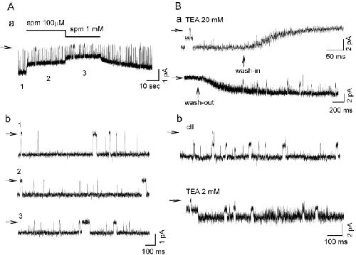 Figure 3. . Effect of spermine and TEA on Kir2.1 single channel currents, recorded from inside-out patches excised from COS7 cell transfected with Kir2.1 cDNA (holding potential of −60 mV). (A a) Application of 100 μM and 1 mM spermine reduced single channel amplitude. The continuous change of the single channel amplitude is particularly evident during the wash-out phase. The expanded traces in b, 1 and 2, are from the corresponding times in A a labeled 1, 2, and 3. (B) Blocking effect of TEA on single Kir2.1 channel currents. With 20 mM TEA, note the increase in open channel noise during the wash-in and washout of TEA (trace a). For 2 mM TEA (2 mM) at steady-state (trace b), the unitary amplitude is reduced but the open channel noise is increased. Zero current levels are indicated by horizontal arrows.