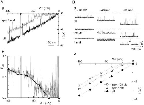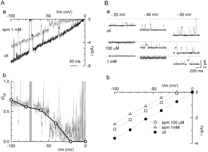 Figure 4. . Two mechanisms of spermine block at different voltages. (A) Single channel recordings during a voltage ramp from −100 to 0 mV, showing the continuous I-V relationship of a single channel in the absence (control) and presence of 1 mM spermine (a). Currents were filtered at 1 kHz and sampled at 2 kHz. The ratio (i/ictl) of the two traces in (a) is shown as the noisy thin line in (b). (B) The single channel recordings at test potentials of −20, −40, and −60 mV in the absence and presence of 100 μM and 1 mM spermine (a). At −60 mV (right), the single channel conductance is reduced by spermine without affecting open channel noise. At −40 mV (middle) in the presence of 100 μM spermine, and at −20 mV (left) in the presence of 1 mM spermine, however, open channel noise is increased. The I-V relations are plotted in (b) and the ratio for 1 mM spermine is plotted in A b (open circles), showing good agreement with the ratio obtained from the voltage ramp.