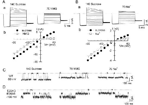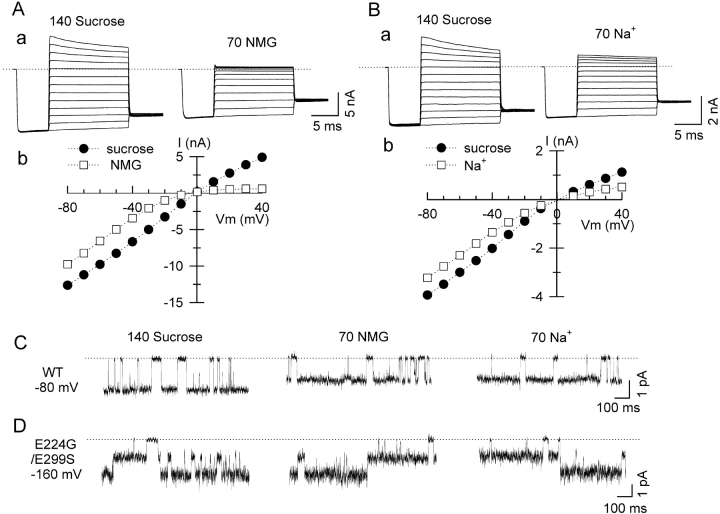 Figure 5. . Effects of ionic strength on wild-type and mutant Kir2.1 channel currents. Ionic strength was increased by replacing 140 mM sucrose with 70 mM NMG+ or 70mM Na+. (A and B) Macroscopic currents (a) of wild-type Kir2.1 channel were recorded with symmetrical 30 mM K in intracellular and extracellular solutions. The macroscopic I-V curves in the presence of sucrose vs. NMG+ or Na+ are shown in (b) in both panels. (C) Single channel recording from wild-type Kir2.1 under symmetrical 30 mM K+ conditions at holding potential of −80 mV. (D) Single channel recording of the double mutant channel E224G/E299S under the same condition at holding potential of − 160 mV. There were two channels in this patch.