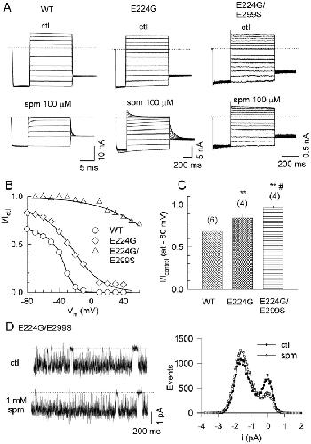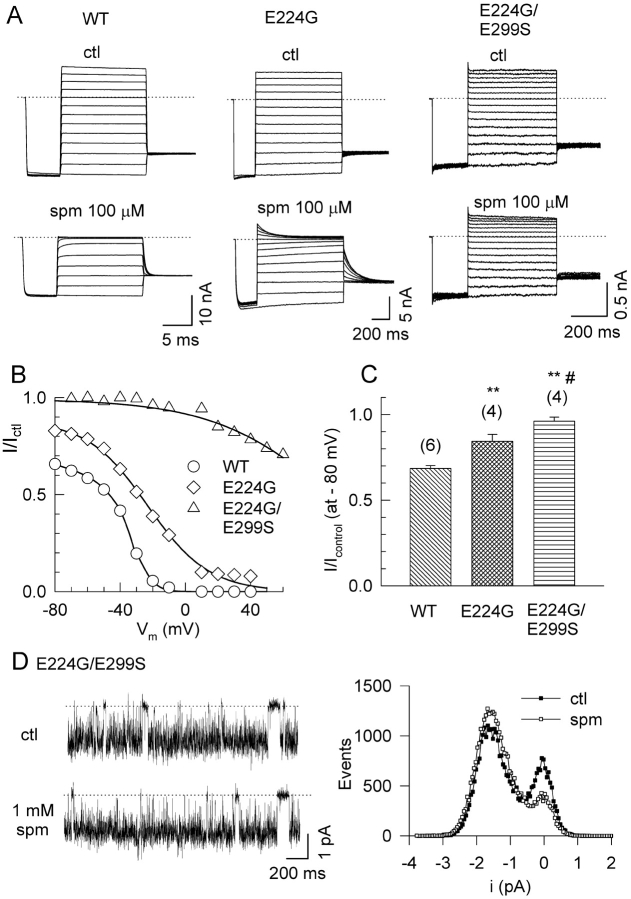 Figure 6. . Effect of neutralizing E224 and E299 on spermine block. (A) Representative macroscopic current recordings from giant inside-out patches excised from oocytes expressing wild-type Kir2.1 (WT), the mutant E224G, and the double mutant E224G/E299S, in the absence and presence of 100 μM spermine. (B) Ratio of the steady-state current in the presence of spermine to that in its absence (Ictl) vs. voltage for WT, E224G, and E224G/E299S. The smooth lines are fitted value to model 2 in Fig. 8 B. (C) Bar graph comparing the reduction in the macroscopic current amplitude at −80 mV by 100 μM spermine, in WT (n = 6), E224G (n = 4), and E224G/E299S (n = 4). **, P < 0.05 compared with WT, and #, P < 0.05 compared with E224G. (D) Single channel recording of the double mutant E224G/E299S in the absence (ctl) and presence of 1 mM spermine. The holding potential was at −80 mV. The left panel shows typical single channel current traces and right panel shows superimposed amplitude histograms.