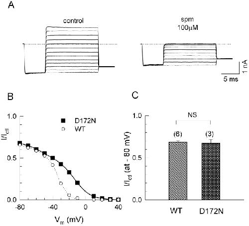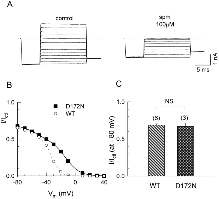 Figure 7. . Effect of neutralizing D172 on spermine block. (A) Representative macroscopic current recordings from oocytes expressing wild-type and D172N channels in the absence and presence of 100 μM spermine. (B) Ratio of the steady-state current in the presence of spermine (I) to that in its absence (Ictl) vs. voltage for WT (the same values as Fig. 6 B) and D172N. The smooth lines are fitted value to model 2 in Fig. 8 B. (C) Bar graph comparing the reduction in the currents at −80 mV by 100 μM spermine, in WT (n = 6), D172N (n = 3).