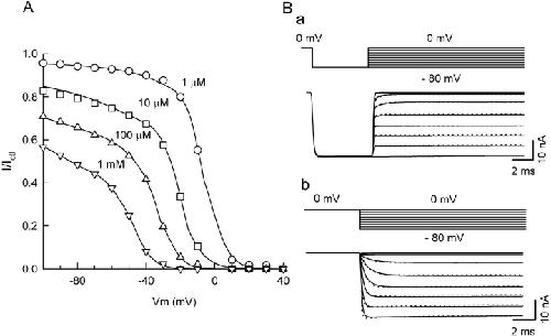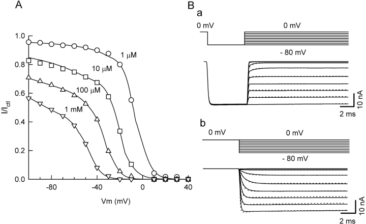 Figure 9. . Fitting model 2 to experimental data. (A) Family of steady-state I-V relationships in the presence of the spermine concentrations indicated. Points are experimental data taken from Fig. 2 C, and lines show the best fit of the model. The parameters determined from the fits are: g01 = 0.48, g02 = 0.28, Kd1 = 5.4 × 10−7 M; Kd2 = 1.48 × 10−5 M, Kd3 = 4.3 × 10−4, Z1 = 0, Z2 = 3.1, Z3 = 4.4. (B) Kinetics of Kir2.1 current block (a) and unblock (b) in the presence of 100 μM spermine using the voltage protocols shown. Points are the experimental data, with best fit of the model shown as superimposed lines. The forward (f) and backward (b) rate constants for the three transitions determined from fit in this patch are: k1f = 2.6 × 1012 M−1s−1, k1b = 1.4 × 106 s−1, k2f = 5.7 × 1012 M−1s−1, k2b = 8.4 × 107 s−1, k3f = 2.4 × 106 M−1s−1 and k3b = 1.2 × 103 s−1.