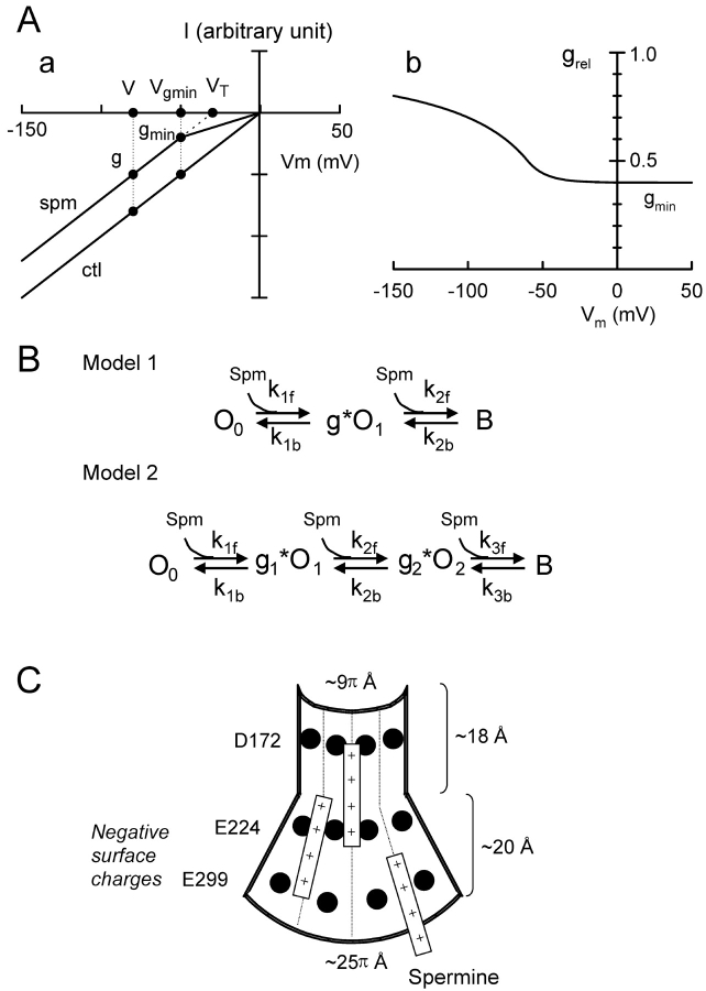Figure 8. . Proposed model for spermine block of Kir2.1 current. (A) Empirical method to obtain fractional reduction in single channel conductance due to charge-screening by spermine. A a shows superimposed I-V curves in the presence (spm) and absence (ctl) of spermine. A b shows the voltage dependence of the relative conductance (grel) obtained from the ratio of the single channel current amplitude in the presence and absence of spermine in a. See text for details. (B) Reaction schemes for models used to fit the results, with g representing the fractional conductance of open state(s) due to charge-screening by spermine. (C) Schematic representation of the inner vestibule of Kir2.1, cut open from its conical shape to form a sheet. Putative locations of D172, E224, and E299 as indicated, with examples of spermine molecules bound electrostatically at various depths.