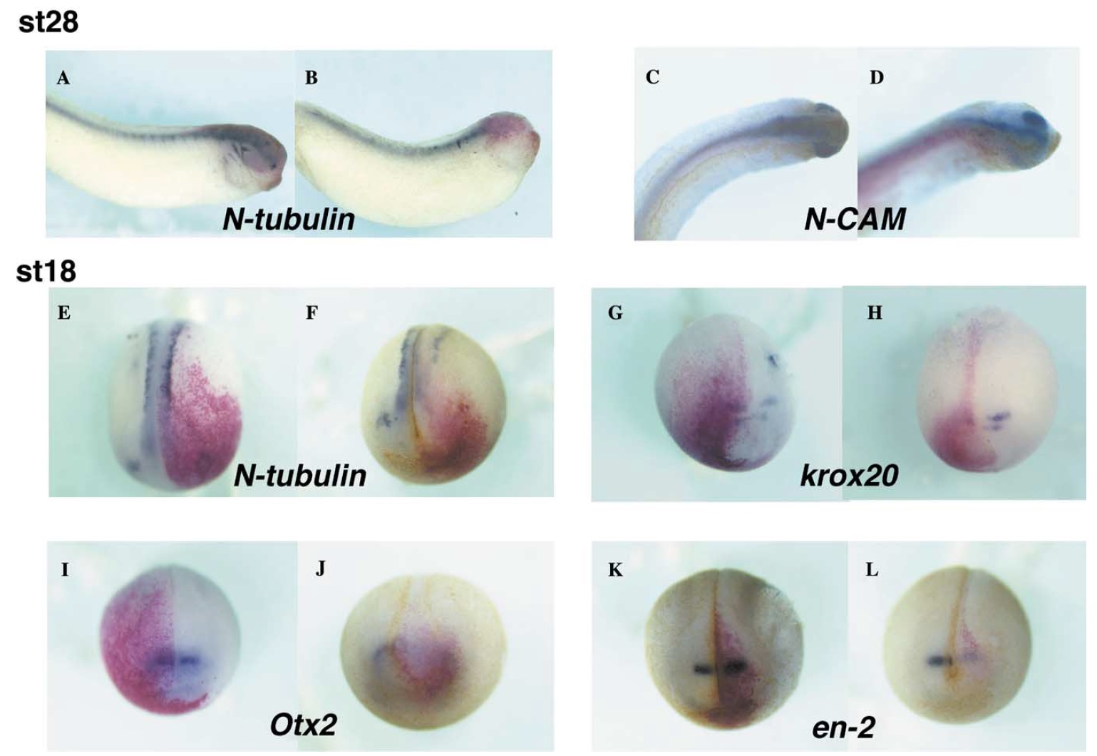 (B, D, F, H, J, L) (40 ng) together with lacZ mRNA (200 pg) as a tracer was injected into a dorsal animal blastomere of8-cell embryos. Embryos were