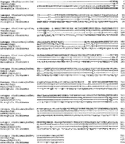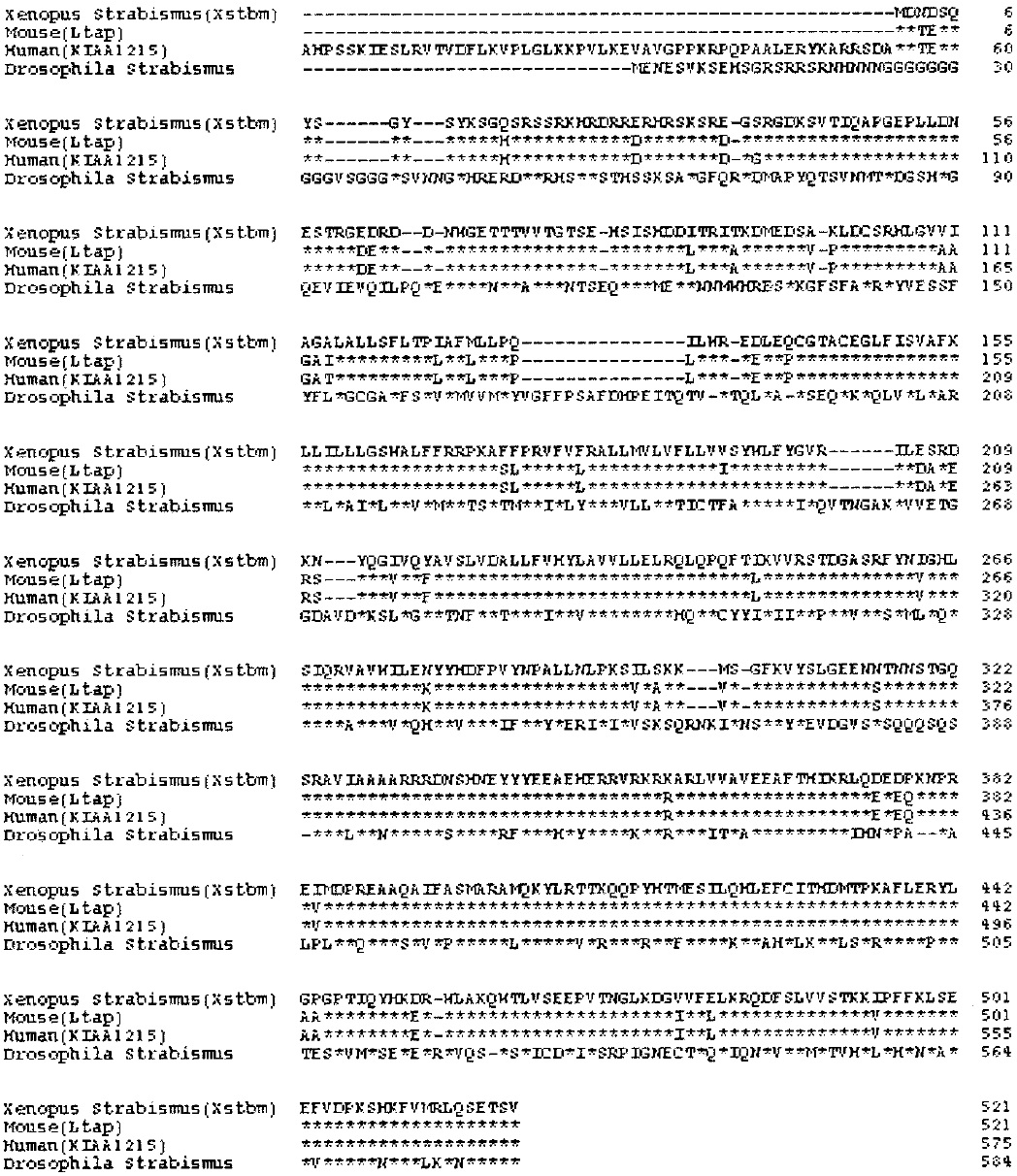 FIG. 1. Alignment of the Xstbm, mouse Ltap, human KIAA1215 and Drosophila Strabismus amino acid sequences. The conserved amino