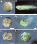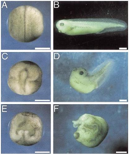 FIG. 3. Overexpression of Xstbm interfered with posterior neural fold fusion and closure of the neural folds to form the neural tube. (A, C, E) Neurula-stage embryos (stage 20). (B, D, F) Tailbud-stage embryos (stage 30). (A, B) Normal embryos. (C, D) Under moderate doses of Xstbm, neural fold fusion and posterior neural tube closure were impaired, and the dorsal axial and paraxial tissues and the neural plate did not converge and extend well. (E, F) Under larger doses, neural fold fusion did not occur and the dorsal axial tissues were very short in the anteriorâposterior axis. Bars, 0.5 mm.
