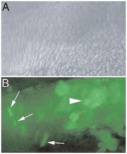 and normal cells (light cells) can also intercalate between one another, such that the Xstbm-injected cells (pointer) wind up among the