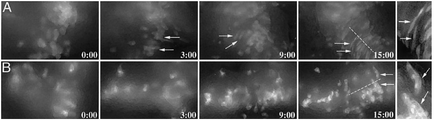 FIG. 7. Frames from time-lapse movies of fluorescently labeled cells show that cells of explants made from normal embryos adopt the