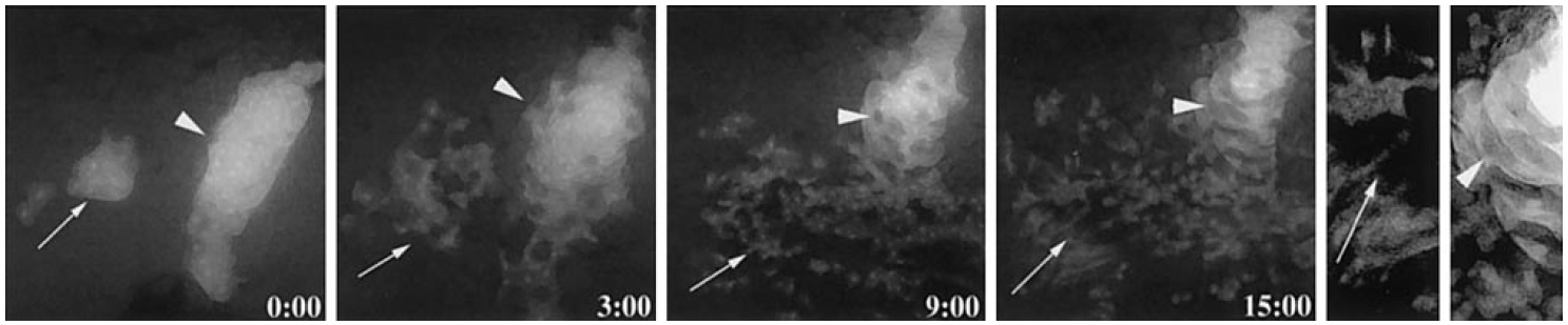 FIG. 8. Time-lapse movie frames show differences between the behavior of normal GFP-injected cells (green-labeled cells on left of each