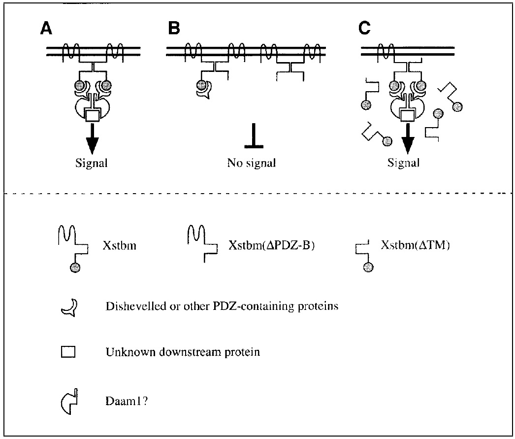 or a reduced signal is transduced (B). Increased expression of Xstbm(PDZ-B) would progressively reduce the normal signal level, also