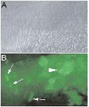 epi-illumination, A, and in fluorescence, B). Note the elongation